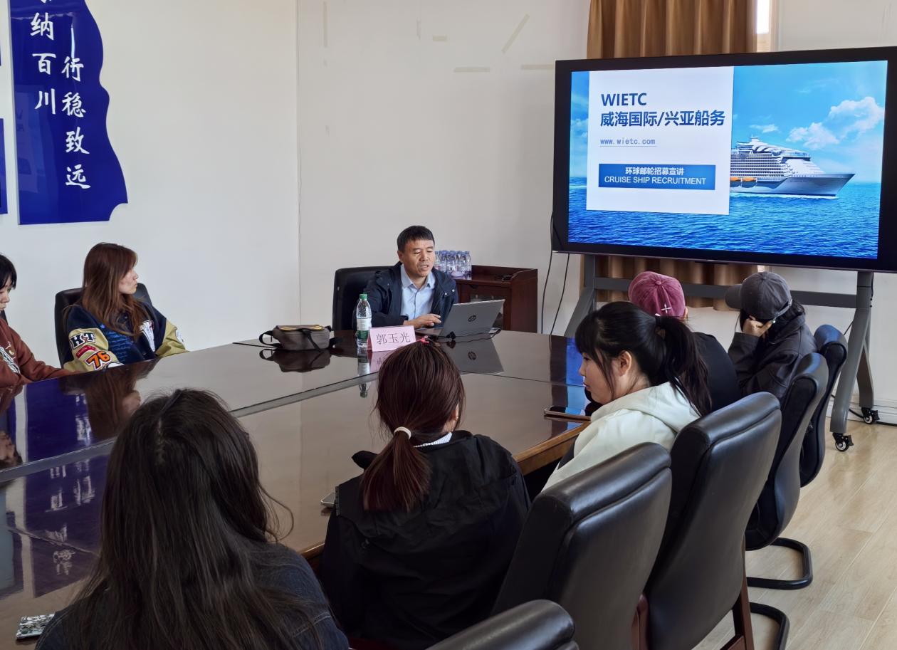 4月24日,盛帆娱乐官网 在大黑石校区艺体中心329会议室成功举办校友企业专场宣讲会。1992级校友、威海兴亚船务有限公司邮轮业务部经理郭玉光应邀返校宣讲,SBOBET 党委副书记付常兵、团委书记周宇颂、辅导员刘家馨及2022级学生代表共同参与活动。