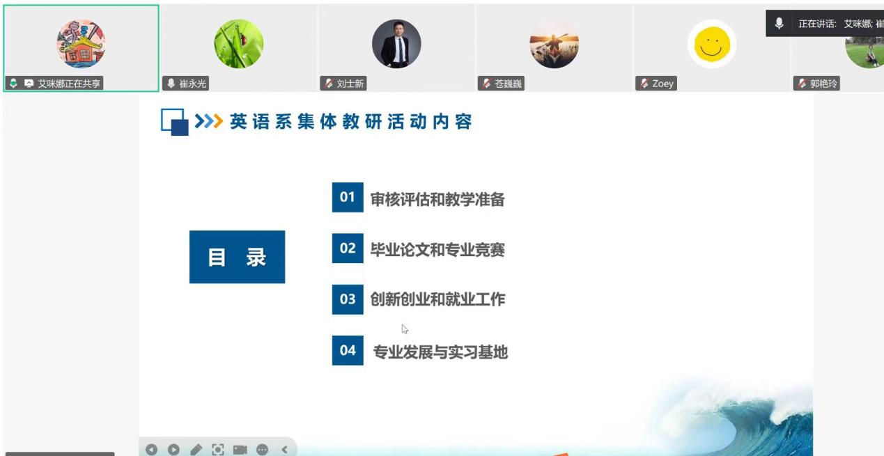 59日晚,盛帆娱乐官网 英语系以线上方式开展五月份集体教研活动,全系教师参加了集体教研会。活动由系主任艾咪娜主持。