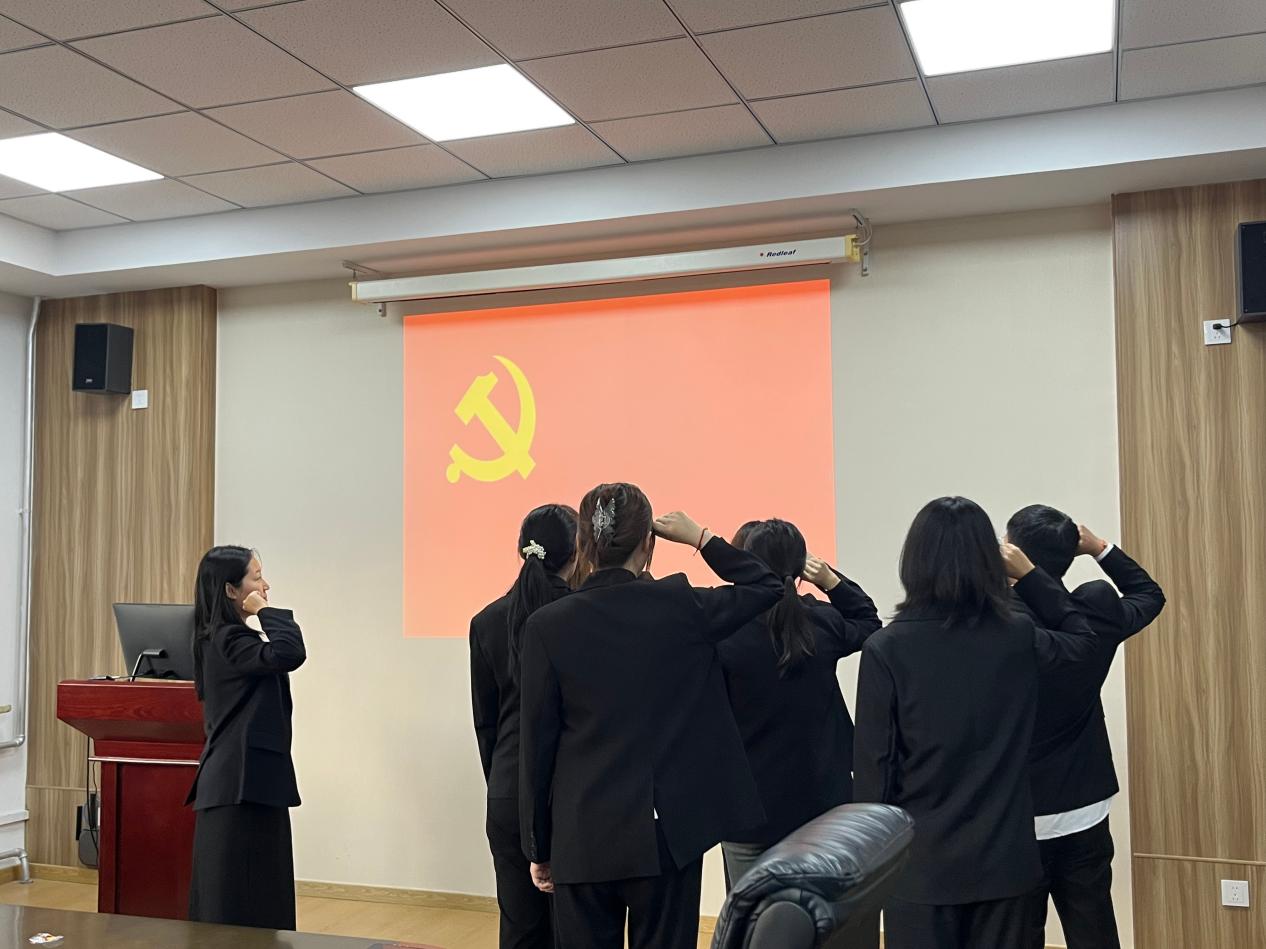 党支部书记刘家馨同志代表支委会向大会报告了每位党员发展对象的审查情况和支委会意见,并对是否符合党员条件发表意见进行充分讨论。经由支部大会全体与会的正式党员充分讨论并进行无记名投票表决,同意接收唐雪薇、陈晨、张舒涵、张秀秀、李天怡、袁釧棚、李佳慧、陈艳春八位同志为中共预备党员。刘家馨为各位同志佩戴党徽,并带领同志们面对党旗进行庄严宣誓,八位同志分别对成为预备党员之后的情况进行表态。