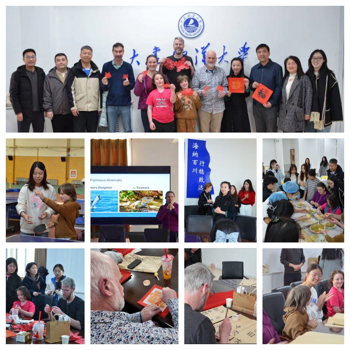 活动期间,中外师生互动频繁、氛围热烈。师生们一同参观了海洋强国广场、图书馆、实训楼与艺体中心等地,全方位感受校园的人文风貌。在艺体中心体育馆内,师生们以球会友,展开轻松愉快的乒乓球切磋,在运动中拉近彼此距离。在中国传统文化体验中,学生们通过民族舞蹈和器乐展演传递中华美学韵味,中外师生共同参与毛笔字书写、新年福字拓印、窗花剪纸等特色活动,一笔一划、一拓一剪间,沉浸式体验传统文化的匠心与温度。交流中,新西兰教师Joelle热情分享了新西兰的风土人情,让师生们对异国文化有了更直观的认知。活动尾声,师生一同前往教师餐厅包饺子、共享美食,在烟火气中延续温馨情谊。