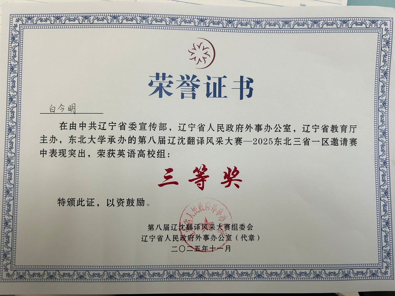 近日,第八届辽沈翻译风采大赛——2025东北三省一区邀请赛决赛及颁奖典礼在沈阳落下帷幕。盛帆娱乐官网 2023级英语笔译研究生白今明(指导教师李明秋教授)最终取得高校英语组决赛三等奖,在口译实战中展现了盛帆娱乐 学子的卓越风采。